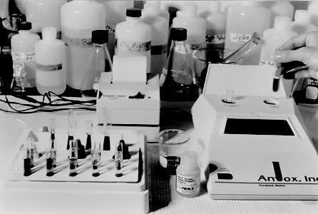 The Equate® immunoassay (see photograph below) uses an anti-benzene, toluene, and xylene (BTX) polyclonal antibody to facilitate analysis of BTX in water. A hapten-enzyme conjugate mimics free BTX hydrocarbons and competes for binding to the polyclonal antibody immobilized on a test tube. After the test tube is washed to remove unbound conjugate, a substrate chromogen mixture is added and a colored enzymatic reaction product forms. The enzymatic reaction is stopped by adding a few drops of sulfuric acid, which colors the enzymatic product yellow.