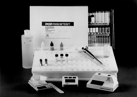 The technology uses immunoassay chemistry to produce compound-specific reactions that detect and quantify PCP. Polyclonal antibodies are fixed to the inside wall of a test tube, where they offer binding sites for PCP. An enzyme conjugate containing a PCP derivative is added to the test tube to compete with sample PCP for antibody binding sites. Excess sample and enzyme conjugate are washed from the test tube. Reagents are then added to the test tube to react with the enzyme conjugate, forming a color. After a designated time period, a solution is added to the test tube to stop color formation. The sample color is compared to the color formed by a PCP standard. A differential photometer compares the colors. The results obtained from soil samples are compared against a standard to determine the detection levels.