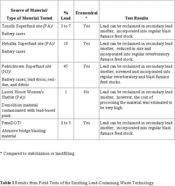 Secondary lead smelting is a proven technology that reclaims lead from lead-acid battery waste sites. The Center for Hazardous Materials Research (CHMR) and Exide Corporation (Exide) have demonstrated the use of secondary lead smelting to reclaim usable lead from various types of waste materials from Superfund and other lead-containing sites. Reclamation of lead is based on existing lead smelting procedures and basic pyrometallurgy.