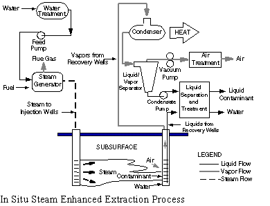 The in situ steam enhanced extraction (ISEE) process removes volatile organic compounds (VOC) and semivolatile organic compounds (SVOC) from contaminated water and soils above and below the water table (see figure below). Pressurized steam is introduced through injection wells to force steam through the soil to thermally enhance the vapor and liquid extraction processes.