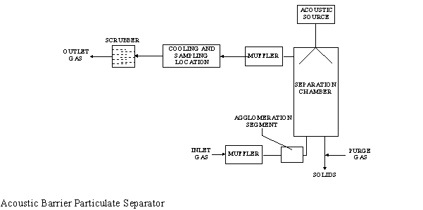 The acoustic barrier particulate separator was accepted into the SITE Emerging Technology Program in 1993. The principal objective of this project will be to design, construct, and test a pilot-scale acoustic barrier particulate separator that is suitable for parallel arrangement into larger systems. The separator will be designed for a flow of 300 cubic feet per minute and will be tested using a simulated flue gas composed of heated gas and injected dust.