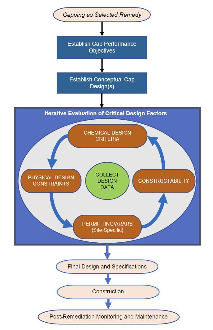 The ITRC Sediment Cap Chemical Isolation Guidance provides a framework for the design, construction, and long-term monitoring of the chemical isolation function of sediment caps. The framework consists of an iterative design process informed by site-specific data that balances achievement of chemical design criteria, physical design constraints, constructability and permitting requirements. In addition, the guidance summarizes key construction considerations and presents a recommended approach for monitoring and evaluating long-term chemical isolation performance. The recommended framework presented in the Sediment Cap Chemical Isolation Guidance is illustrated below.