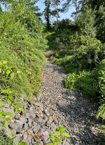 - Reduced stormwater runoff by approximately 5% when compared to pre-remediation site conditions by converting impervious surfaces to vegetated surfaces. Additional runoff is retained for onsite infiltration via vegetated swales installed along the cap perimeter and the paved recreational path. Also, a level spreader and vegetated filter strip installed on the downgradient side of an onsite parking lot filters the parking lot runoff and prevents associated erosion.