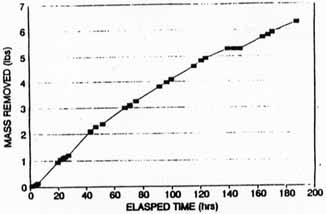 A review of the data shown in Table A-2 indicates that a total of 38 pounds of CCl4 and chloroform were extracted from the deep wells (35 pounds from SVE-1D and 3 pounds from SVE-2D). A total of 6.5 pounds of CCl4 and chloroform were extracted from the shallow wells (6 pounds from SVE-1S and 0.5 pounds from SVE-2S). The deep well that operated for approximately 200 hours extracted 35 pounds of CCl4 and chloroform compared to the shallow well that extracted 6 pounds of contaminants, and the deep well that operated approximately 50 hours extracted 3 pounds of CCl4 and chloroform compared to the shallow well that extracted 0.5 pounds of contaminants.