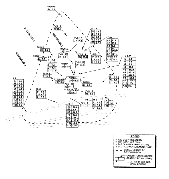 The results of soil gas surveys conducted by EPA at the site and shown in Figure 3, indicate that the highest CCl4 concentration measured in the soil gas was 1,234 parts per million volume (ppmv) at 112 feet below the ground surface. In addition, CCl4 concentrations were highest at depths of greater than 40 feet below ground surface. [1, 2]