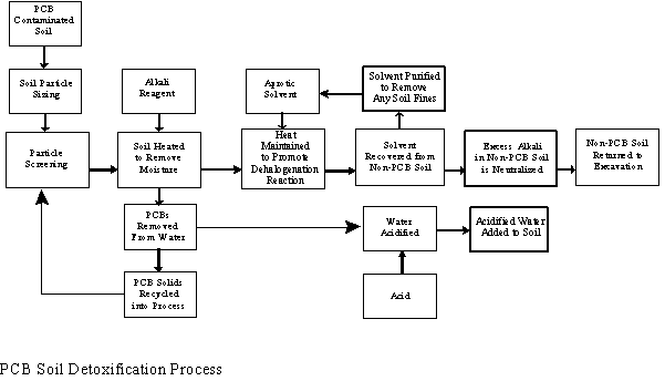 The reagent, consisting of a solvent and an inorganic alkali material, completely strips chlorine from the PCB molecule. Excess alkali can be easily neutralized and is reusable in the process. Treated soil can be returned to the excavation once analytical results show that PCBs have been destroyed.