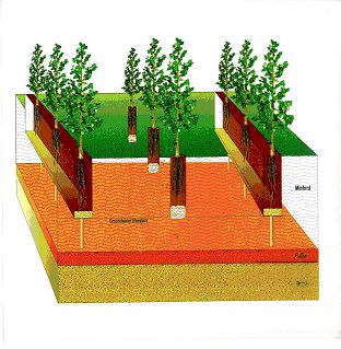 A phytoirrigation system for contaminated groundwater has been implemented at Beale Air Force Base in California (U.S.). At this site, a combination of trees, irrigation, and a containment wall are being used to control a plume containing chlorinated solvents, primarily TCE. A backup granular activated carbon treatment system is available for times of the year when the phytoirrigation system cannot provide adequate hydraulic control. In this application, evapotranspiration by the trees and grasses provide an inward hydraulic gradient across the containment wall. A 600 m barrier wall, keyed into the underlying bedrock, provides a low-permeability boundary around the contaminated area to reduce the quantity of water that moves through the wastes. Groundwater within the barrier wall is collected by a subsurface drainage system and is used to irrigate the vegetation to supplement root uptake directly from the aquifer. At Beale, the tree system consists of an open stand of native cottonwood trees (P. fremontii) interspersed with live oak (Quercus wislizenii). Evapotranspiration is dominated by cottonwood and live oak during the summer, and by live oak and native grasses during the winter. A complex plant community with a number of other species was also established as a part of the important goal of ecosystem restoration. These other species include a number of grasses, legumes, forbs, and shrubs such as deergrass (Muhlenbergia rigens), meadow barley (Hordeum brachyantherum), clustered field sedge (Carex praegracilis), and narrow-leaved willow (Salix exigua).