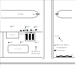 MTBE's high water solubility and low adsorbtivity render it more mobile and dispersive than other gasoline constituents, yet high MTBE concentrations are retained in an anomalously small area based on groundwater monitor well concentrations. A 95% decrease in MTBE concentrations observed between the source well and the downgradient well located approximately 20 feet apart led to the hypothesis that the pre-existing trees were intercepting and remediating the majority of groundwater impacted with MTBE. Less than 10 feet directly downgradient from the USTs, a row of five 33-43 feet high conifers spaced 12 to 14 feet apart border the USTs.