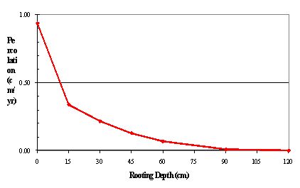 Landfill gas (LFG) inhibits plant growth on landfill covers. Well-established plant growth and deep root penetration are critical to the success and effectiveness of vegetated landfill covers. Poor vegetative stands can result in reduced transpiration, increased percolation, and increased erosion regardless of the thickness of the cover. Therefore, it is important to evaluate the potential effects LFG may have on cover performance. The figure on the right illustrates how reduced rooting depth results in increased percolation.