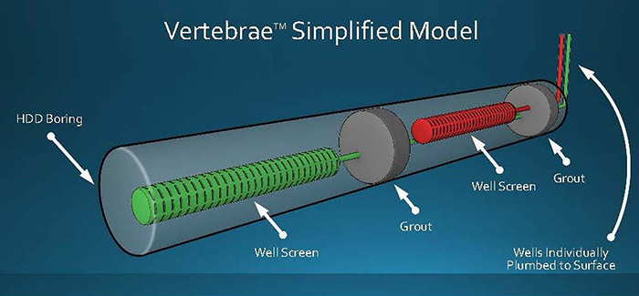 Construction of a vertical well typically includes the installation of a filter pack to further prevent formation materials from entering the well and from clogging the screen; the approach often involves pouring fine-grained sand through a tremie pipe into the annular space between the screen and borehole wall. With HRW installations, however, gravity causes formation materials to collapse and fill the small annular space around the screen, which can make it even more challenging to keep fine-grained particles out of the well. Specialized screens are available that have added filtration capabilities. Specialized screens are available with additional filtration capabilities. One example is constructed of inner- and outer-slotted HDPE pipes around a geocomposite layer (EnviroFlex, Ellingson-DTD, Bellfonte, Pennsylvania).