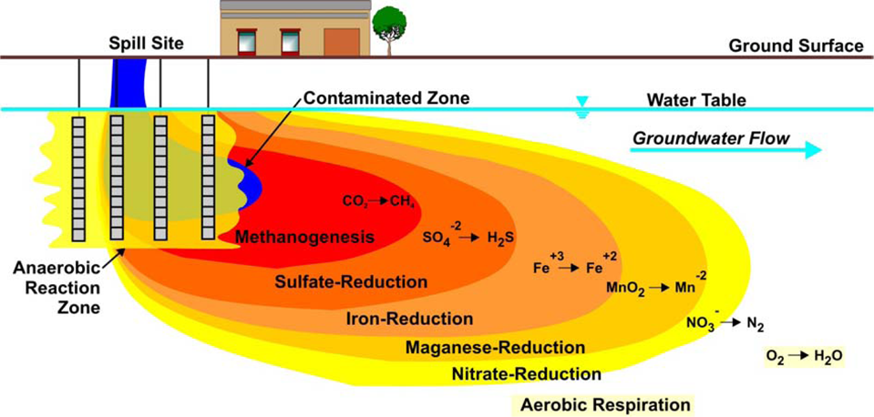 Figure 2. Anaerobic microbes use electron acceptors in preferential order: nitrate, manganese, ferric iron oxyhydroxides, sulfate, and carbon dioxide (Source: Parsons 2004).
